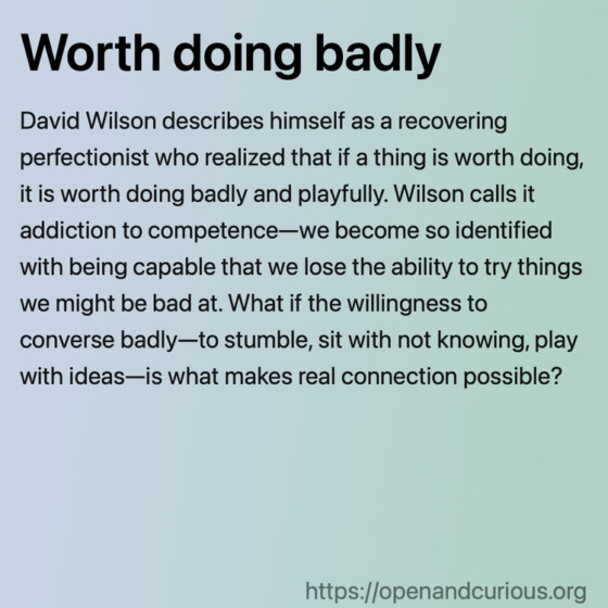 There’s a familiar inversion lurking in that phrase. The original saying—”if a thing is worth doing, it is worth doing well”—has been weaponized into a perfectionist’s creed: don’t attempt what you can’t excel at. Wilson flips it entirely. Worth doing badly. Worth doing playfully. Not as a consolation prize, but as the actual point.